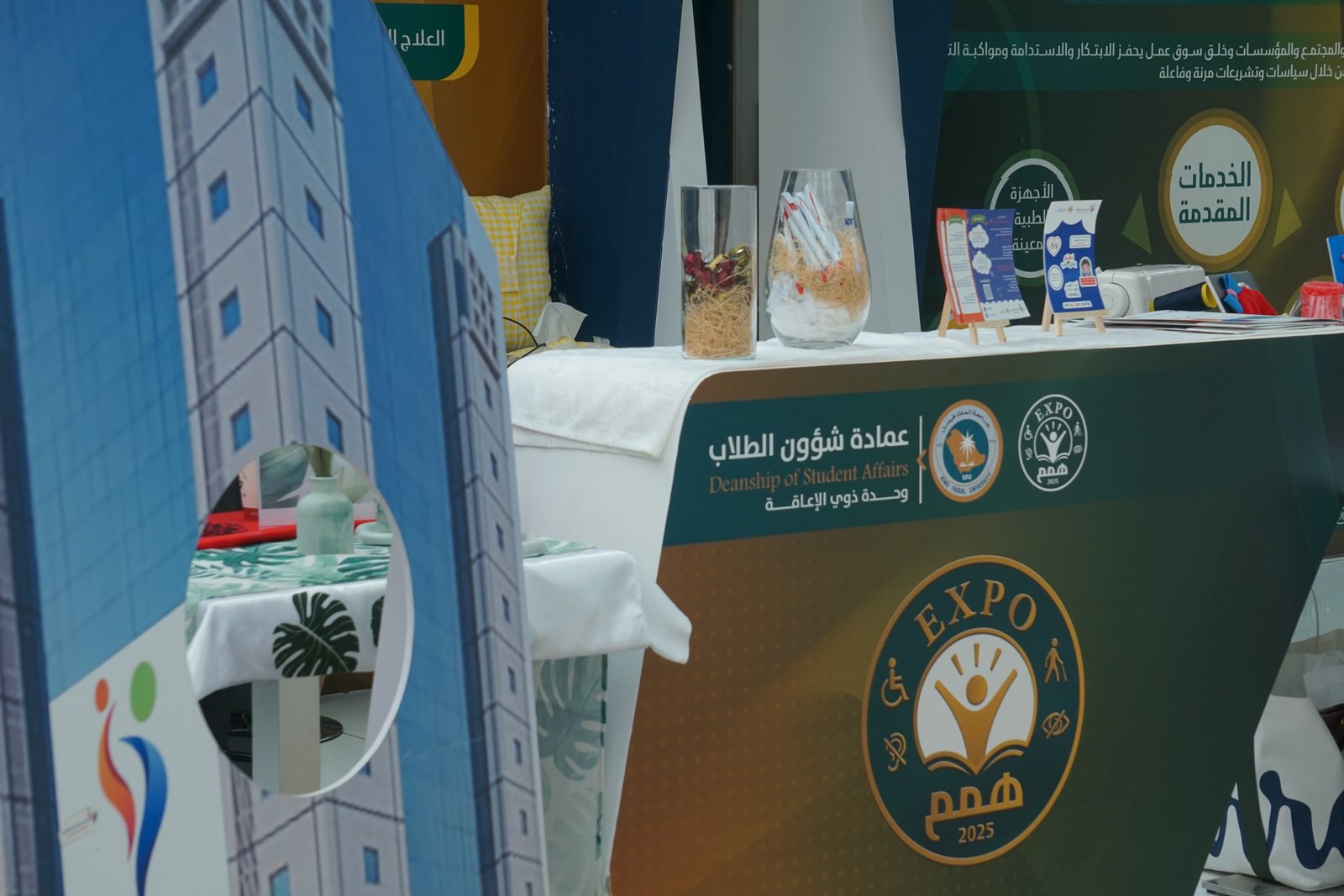 كما حضرت الإدارة العامة للعلاقات العامة والإعلام بركن متميز، قدّم تعريفاً بخدمات الجامعة الإعلامية ومنصات التواصل، إلى جانب إبراز الدور الإعلامي في دعم مبادرات أصحاب الهمم ونشر الوعي المجتمعي. وحرص الركن على خلق جو تفاعلي من خلال أفكار مبتكرة ومسابقات تعريفية وأسئلة تحفيزية أسهمت في جذب الزوار وتشجيعهم على التعرّف أكثر على الجهود الإعلامية المبذولة داخل الجامعة، إضافة إلى التعريف بالخدمات المتاحة لفئة ذوي الإعاقة عبر الوسائل الرقمية.